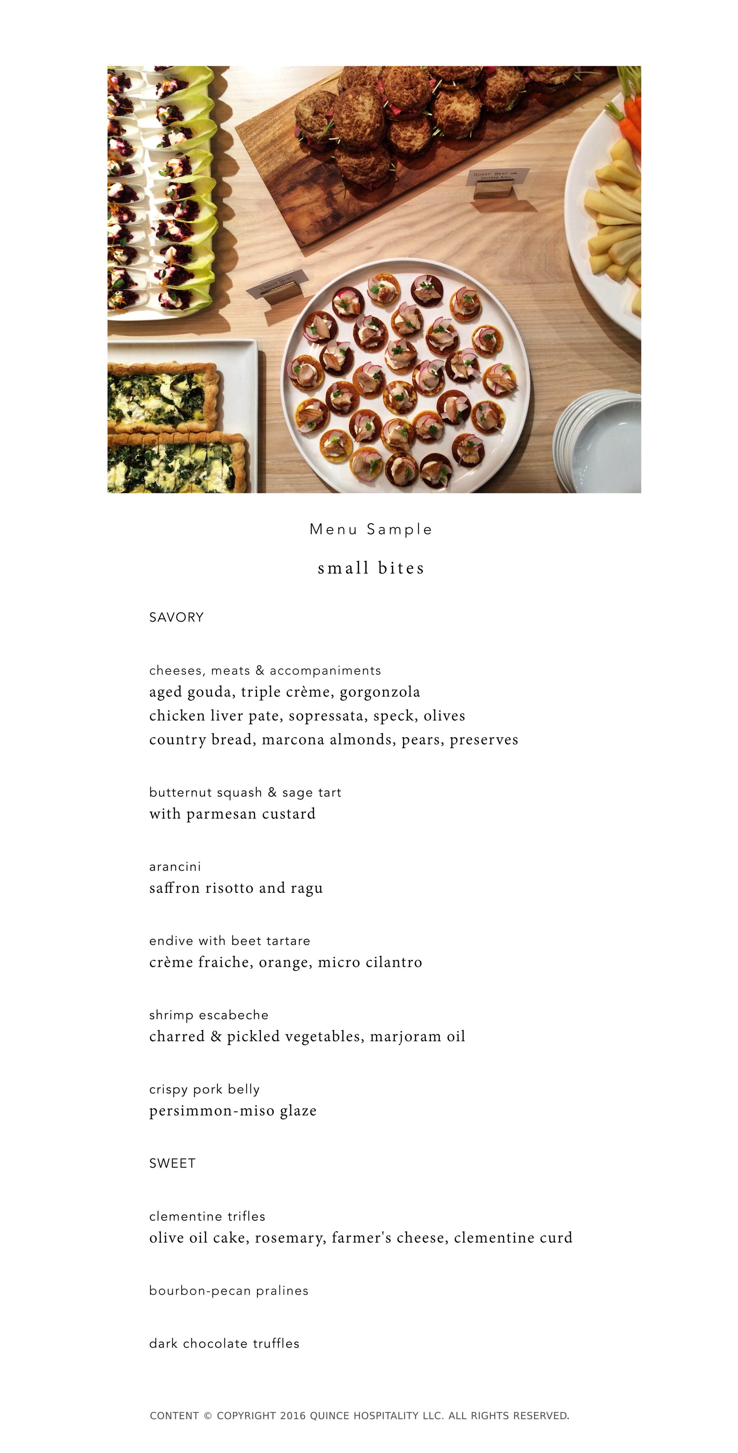 Because we write our menus specifically for your event, the dishes and ingredients naturally reflect an emphasis on seasonality and sustainability. We are always searching for the best ingredients from local farmers and purveyors to enrich our menus.